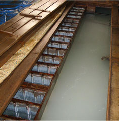 Comme indiqué plus haut, remplissez d’eau les moules de glace en utilisant les tubes d’alimentation d’eau, appuyez sur le bouton et démarrer le système de réfrigération. L'agitateur fait circuler l’eau par cycle ce qui permet un transfert de chaleur avec le réfrigérant se trouvant dans les bobines d’évaporation. La température est ensuite abaissée. Il y’ a transfert de chaleur entre la saumure à basse température et l’eau douce dans les moules de glace. Cette dernière verra sa température se réduire à moins de 0 degrés pour devenir de la glace. Après un certain temps de réfrigération, toute eau se trouvant dans les moules se congèle et forme des blocs de glace. La grue va soulever une rangé de moule, la transporter et la déposer dans le réservoir de dégel plein d’eau chaude. Cette même rangé sera relevée puis transportée jusqu’au réservoir de décharge. Retournez-le vers le bas et les blocs de glace se démouleront. Remettez les moules vides en place puis utilisez les tubes d’alimentation d’eau pour les remplir de nouveau jusqu’à un certain niveau. Recommencer l’opération avec chaque rangé de moule.